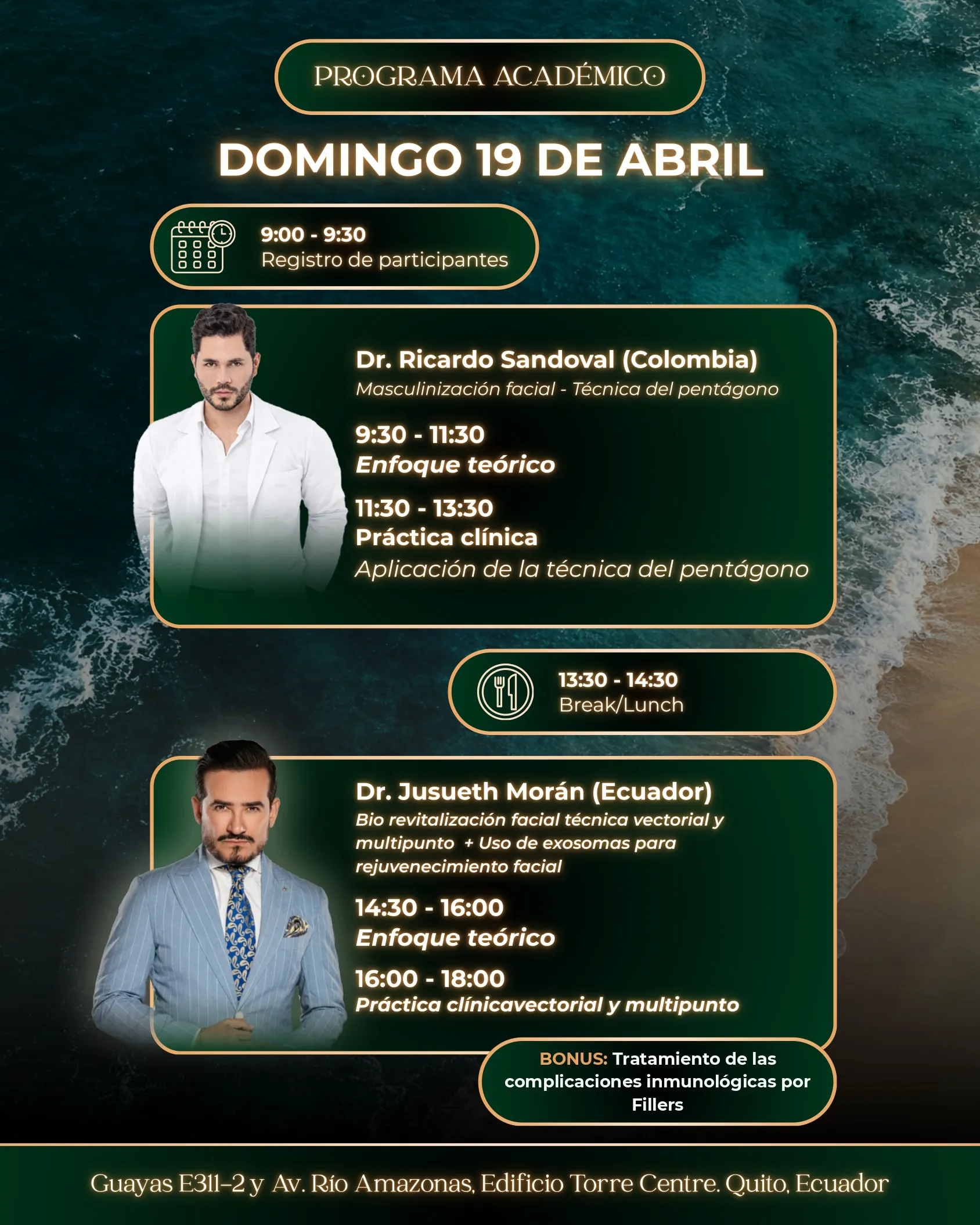 Aprenderás cuatro técnicas avanzadas de manos de dos referentes reconocidos de Colombia y Ecuador, con práctica clínica real supervisada. Teoría con fundamento. Pacientes en vivo. Resultados que puedes replicar desde el primer día de regreso a tu consulta.